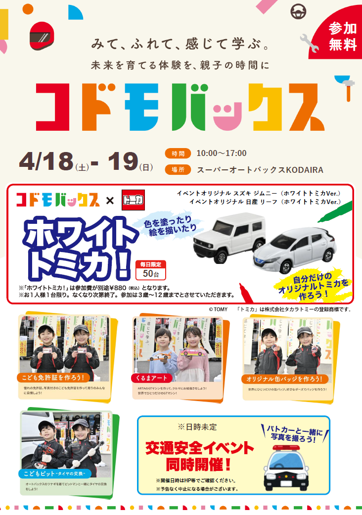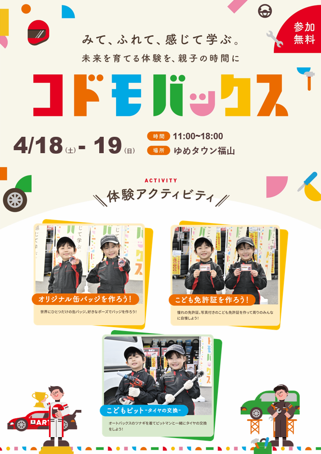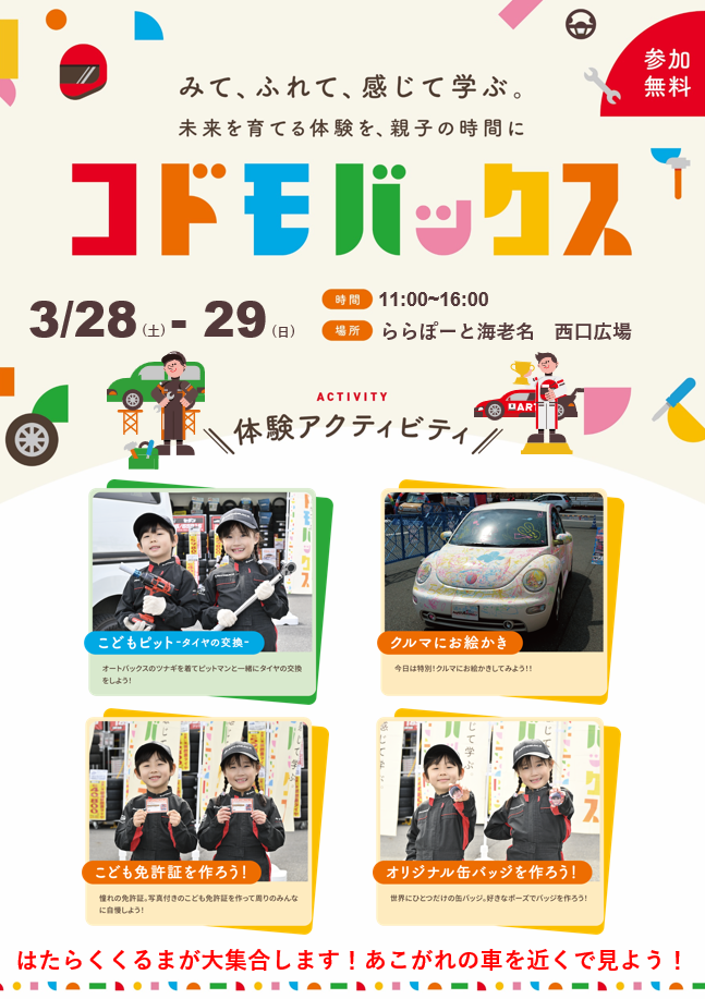 オートバックスの店舗にて、お子様に車にまつわる様々なアクティビティをお楽しみいただくイベントになります。