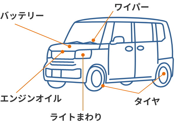 タイヤ・エンジンオイル・バッテリー・ライトまわり・ワイパーの5項目を点検させていただきます。