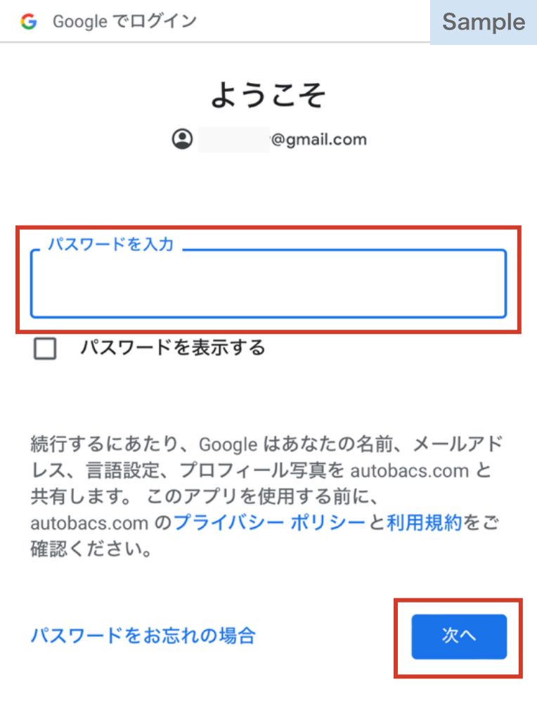 Googleアカウントのパスワードを入力し、[次へ]ボタンを押します。