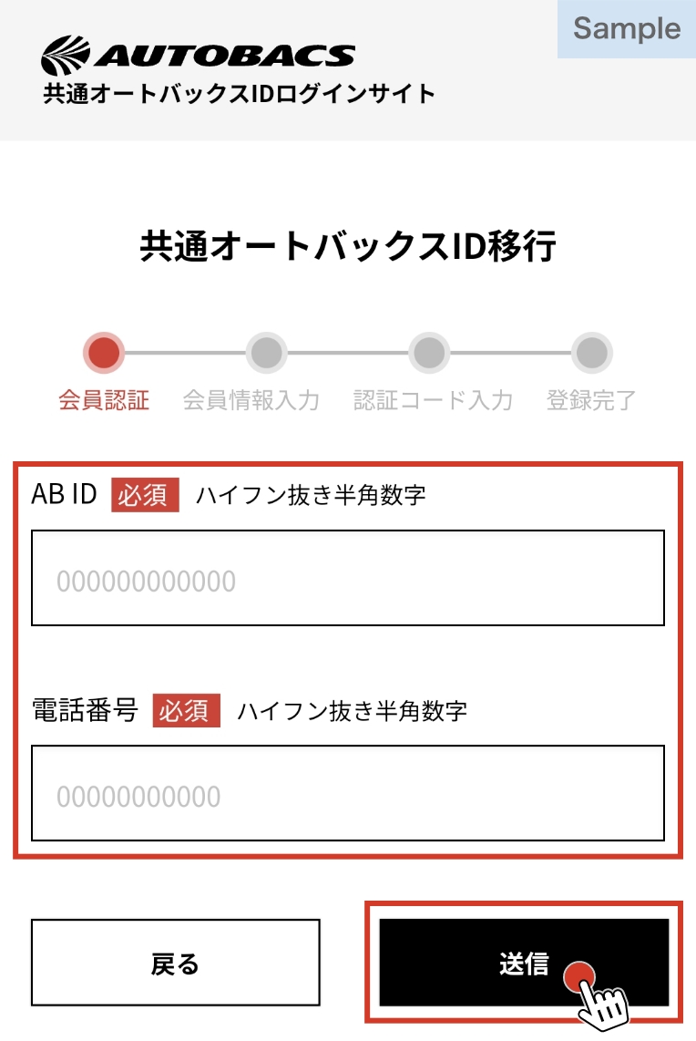お持ちのAB ID(カード番号)と電話番号を入力し、[送信]ボタンを選択します。