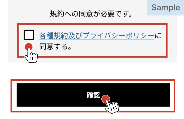 [各種規約及びプライバシーポリシーに同意する]にチェックを入れ、確認ボタンを選択します。